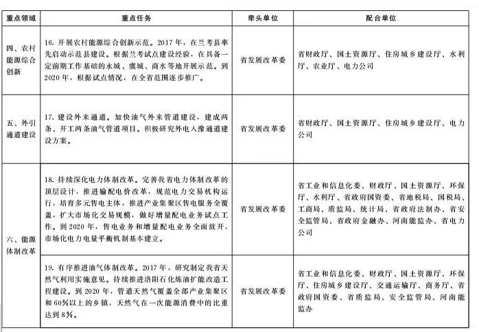 1.持续深化电力体制改革。2017年,完善我省电力体制改革的顶层设计。建立电力体制改革管理体制和会商机制,成立河南省电力体制改革领导小组,建立重大问题会商机制。完成输配电价改革,执行输配电价政策,降低工商用户用电成本。建立河南省电力市场管理委员会,构建市场主体自治性议事机构。完善我省电力交易中长期交易市场,制定河南省电力市场交易规则。扩大市场化交易规模,多途径培育售电主体,规范发电企业、售电公司注册和市场交易,放宽电力用户准入条件,推进产业集聚区售电服务全覆盖。开展跨区跨省电力直接交易试点。启动第二批增量配电业务改革试点工作。2018年,适时开展电力交易机构股份制改革,完善电力市场管理委员会议事规则和制度,建立优先发电和优先购电制度,探索建立电力辅助服务市场,引导社会资本投资、建设、运营增量配电网,积极争取开展国家电力现货交易试点。到2020年,售电业务和增量配电业务有序放开(按照国家拟定时间节点执行),市场化电力电量平衡机制基本建立。