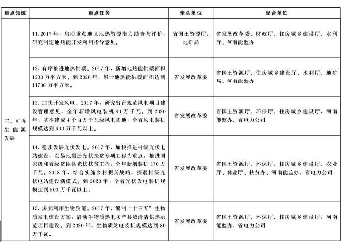 1.积极稳妥推进地热供暖。2017年,启动重点地区地热资源潜力勘查与评价,研究制定地热能开发利用指导意见,持续推进清丰、鹿邑、沈丘、范县、兰考等地热供暖试点建设,全年新增地热供暖面积1200万平方米。2018年,持续推进全省地热资源潜力勘查与评价,摸清资源底数,不断完善地热能开发利用政策体系和管理方式,总结地热能供暖区域连片推进开发利用模式,将地热供暖纳入城镇基础设施范围,统一规划,有序开发,在具备条件的地方,以城镇新规划区、公共建筑和新建住宅小区为重点进行复制推广。到2020年,全省地热供暖面积累计达到11700万平方米。