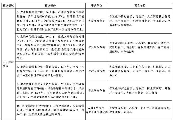 3.促进省骨干煤炭企业转型发展。2017年,出台省属煤炭、电力企业战略重组一体化合作方案。2018年,进一步强化煤电联营,以股权合作为重点推进省属企业煤电一体化。加快河南能源集团煤化工高端化发展,2020年乙二醇产能达到150万吨以上,建成全国最大的乙二醇及深加工基地。推动平煤神马集团尼龙化工、煤焦化工发展,2020年尼龙系列产品产能达到200万吨,建成具有全球影响力的尼龙城;焦炭产能达到1700万吨,利用焦炉尾气建成4吉瓦高效单晶硅太阳能电池片生产基地,形成完整的煤焦化产业链条。支持煤炭企业建设绿色矿山和智慧煤矿,实施精煤行动,加强洗选能力建设,提供优质清洁产品,到2020年,全省煤炭洗选率达到67%。